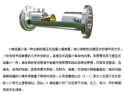 V錐流量計(jì)是一種全新的差壓式流量計(jì)量裝置,并以獨(dú)特的邊壁逐步收縮節(jié)流方式,一改傳統(tǒng)節(jié)流的幾乎所以缺點(diǎn),是差壓式流量計(jì)成果,因此V錐流量計(jì)可廣泛用于石油,化工,電力,熱供等國民經(jīng)濟(jì)各領(lǐng)域